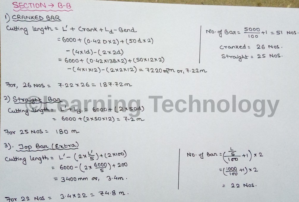 In the figure given below, I have shown Calculation of cutting length of Cranked bar, Straight bar, and Top Bar extra at Section B-B.
